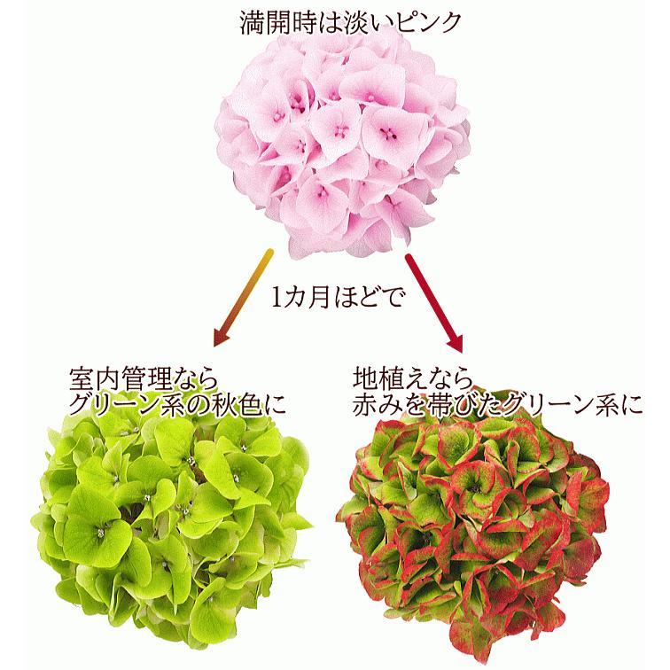 コットンキャンディー ヒューケラ(2株) アジサイの花の色づきにあわせた同系色のリーフによってアジサイが本来もつ花の存在感を引き立てます。 花いろの変化はこんなにも魅力